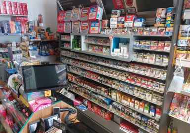 Lottoterminal, Fahrkartenterminal, Kaffeemaschine, Scannerkasse (Cloud-Lösung), diverse Regale für Tabak, Zeitschriften, Karten, usw. Der Bodenbelag ist Linoleum.