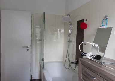 Das Bad verfügt über eine moderne Duschwanne mit Glas-Trennwand, ein weisses top modernes Waschbecken mit Unterschrank ist vorhanden. Der Boden ist hellbeige gefliest. Das Badezimmer verfügt über ein Fenster, sowie Anschlüsse für Kondenstrockner und Waschmaschine (eigener Wasserzähler). Eingebaute Deckenspots sorgen für ein angenehmes Licht.